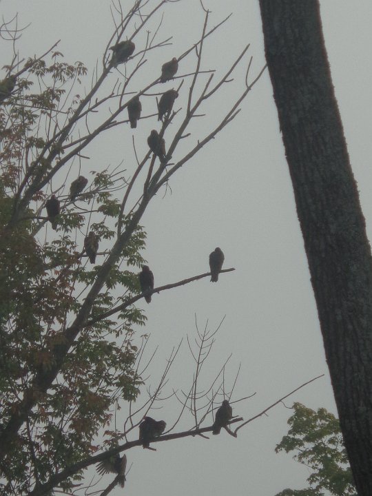 32 Raven gathered in the early morning fog on a tree. Greetings from Hitchcock.