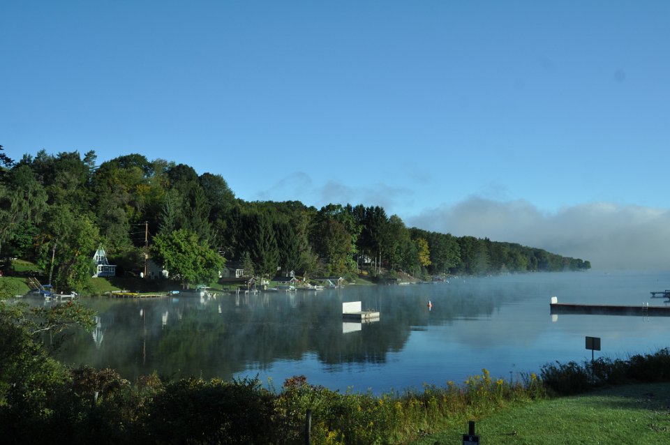 44 Rushford Lake on the day we had to depart. No clouds, just fog on the lake in fresh air of the early morning.